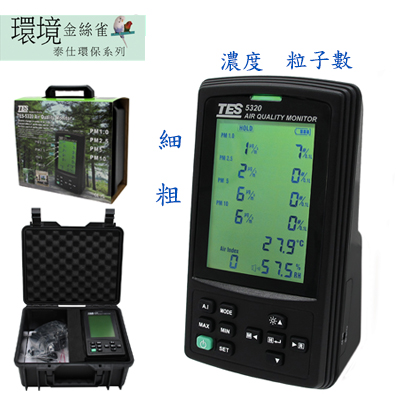 量测空气中灰尘量的最简单工具(室内空间) 直接读取现场空气污染状况 不需搭配手机上云端读取再制数据也无网络塞车的困扰,可装电池或插电方便使用 正确的温度、湿度读值 混合气体(VOCs-挥发性有机化合物)之测量,对H2、 C2H5OH、C4H10、CO及CH4具有高灵敏度(TES-5322A) LCD背光功能 PM2.5最大值、最小值及其发生时间锁定 健康指标(0~9)检测及警示、6色LED指示分级